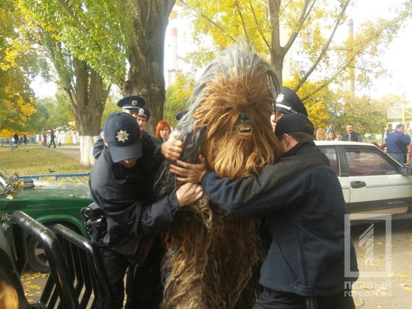 - Para completar el cuadro, la policía ucraniana ha detenido en Odessa a Chewbacca cuando llevaba en coche a Darth Vader para hacer campaña en un colegio electoral.