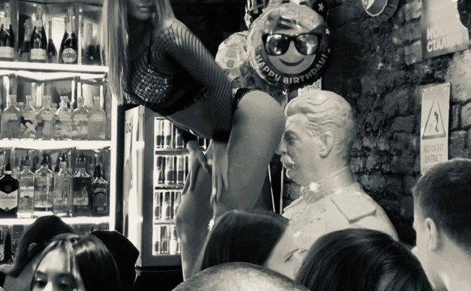 В баре «Ломоносов» в Санкт-Петербурге балерина в нижнем белье каждую ночь «танцует», терясь о фигуру Сталина. Еще одна статуя Ленина стоит на страже на лестнице.