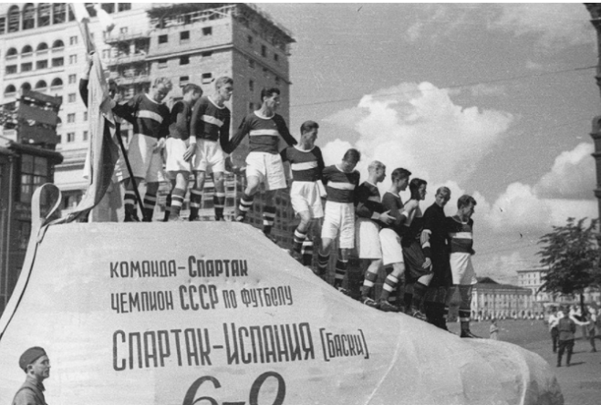 В 1936 году на Красной площади состоялся футбольный матч. Поединок проходил между игроками московского «Спартака» и сборной других тогдашних советских команд. За игрой наблюдал Сталин, который, видимо, был хорошим болельщиком, хотя порой бывал крут в своих реакциях. Тот фвакт, что ключевая роль в празднике была отведена «Спартаку», понравился не всем в советском руководстве. (Автор, очевидно, намекает на известный эпизод с Лаврентием Берия, который так болел за свою ведомственную команду «Динамо», что подверг руководство «Спартака» уголовному преследованию, чтобы устранить конкурентов — прим. ред.).